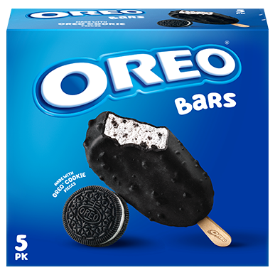 OREO bars feature creme-flavored frozen dairy dessert packed with OREO cookie pieces and dipped in a delicious coating made from crushed OREO wafer pieces.