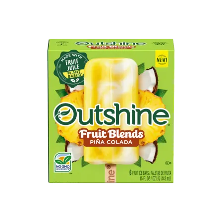 Outshine® Fruit Blends swirl together perfectly paired fruit flavors to create works of yum - visually stunning, mouthwatering frozen fruit bars. Each bar is crafted with its own unique swirl: Piña Colada combines tangy Pineapple with non-dairy Coconut cream. Get ready for a burst of deliciousness with every bite!
