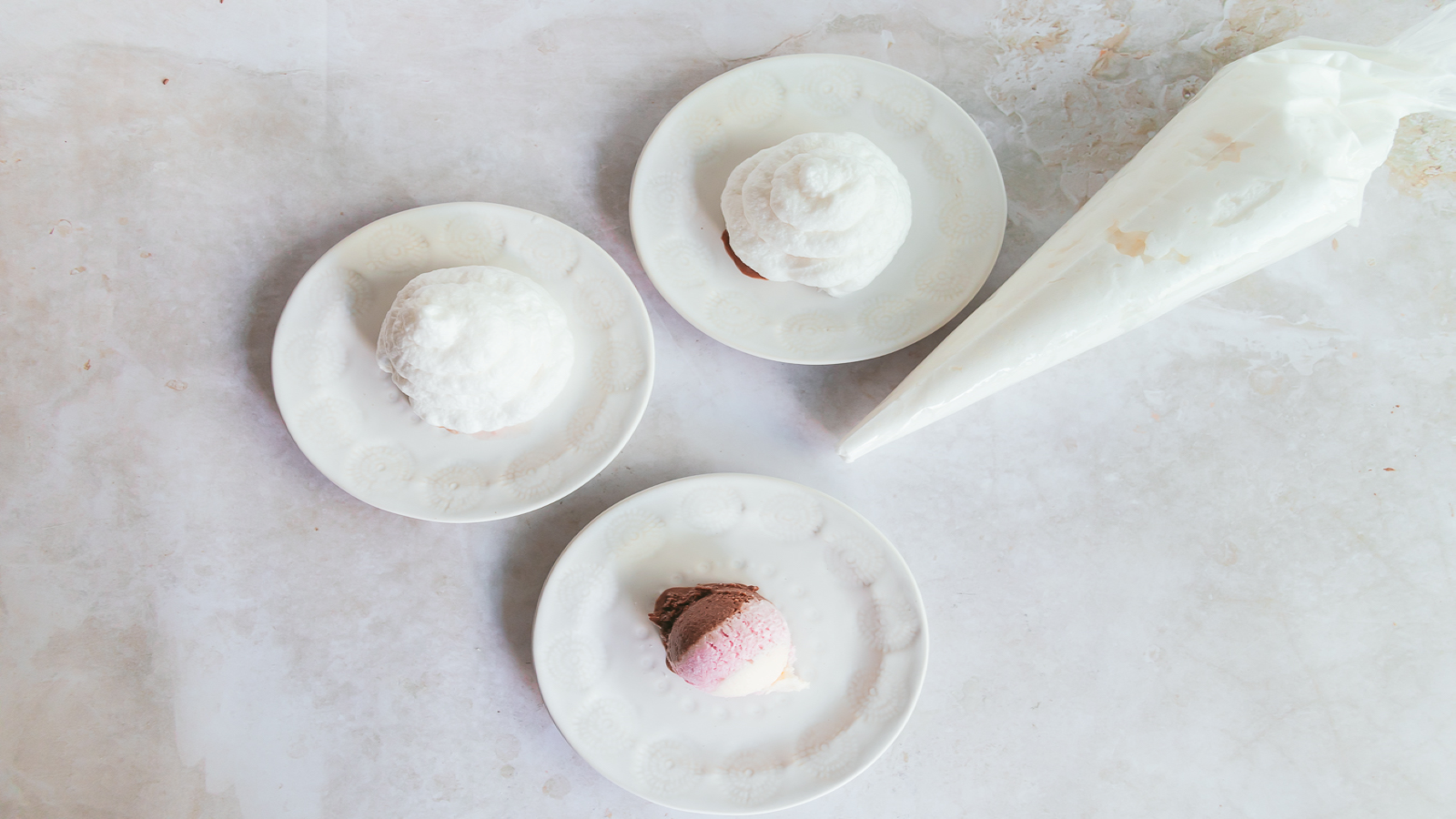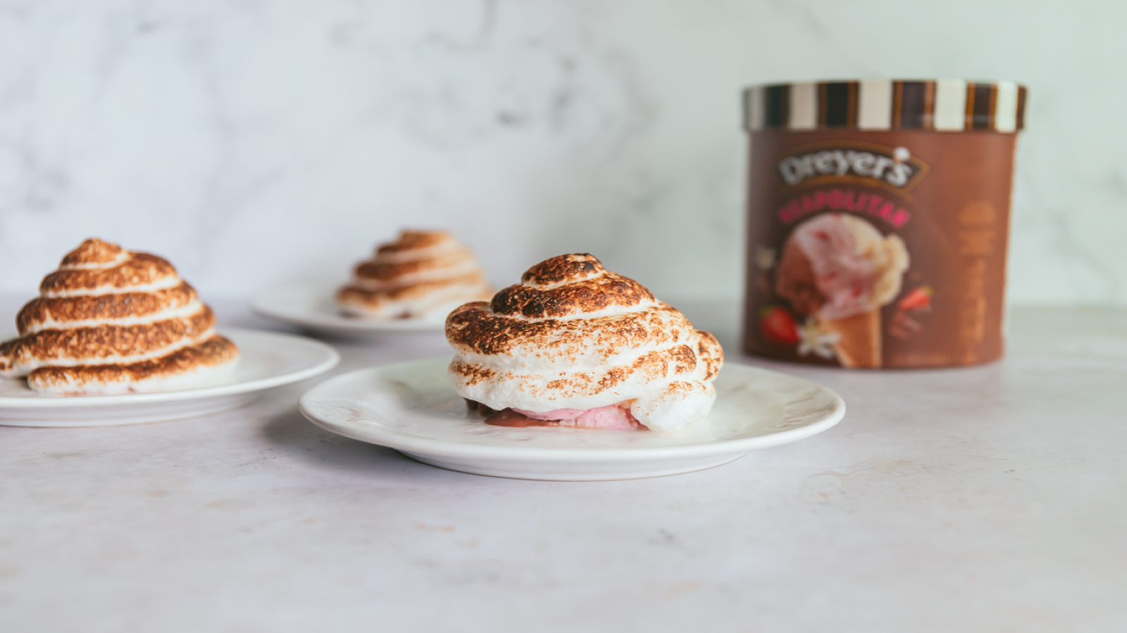 Place the meringue into a freezer bag and cut off the tip on one edge. Pipe around the ice cream scoops.