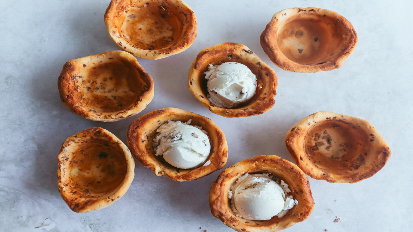 Let cool for about 10 minutes before removing. Fill with a generous scoop of ice cream, drizzle with the cinnamon roll icing, and top with a single pecan.