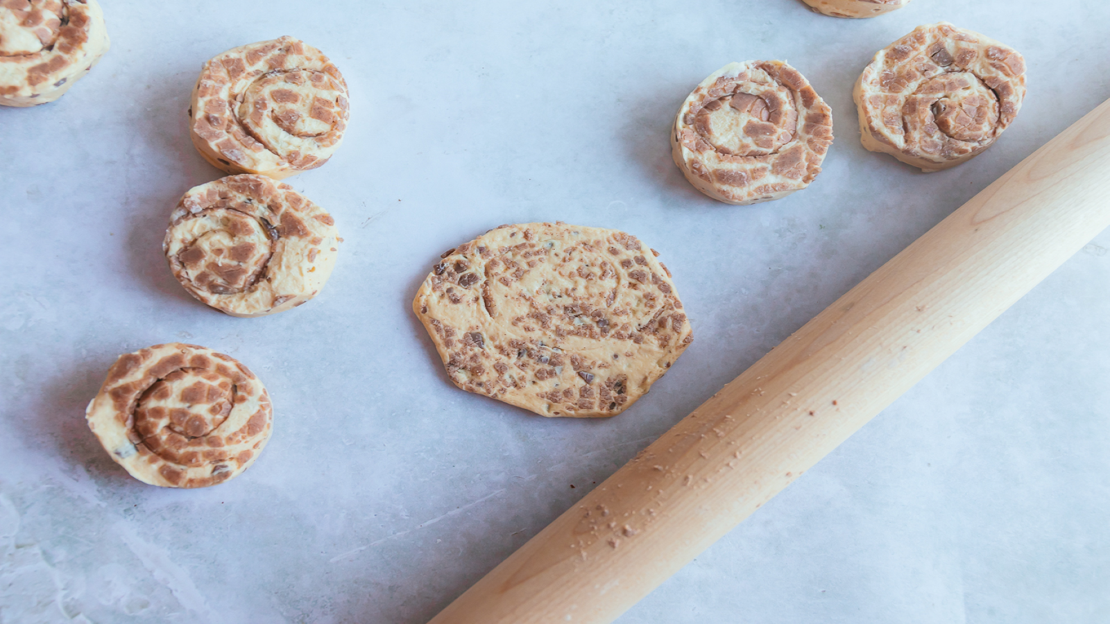 Dust out the cinnamon roll dough with a little bit of flour and roll out into about a 5-inch circle. Wrap each cinnamon roll around the prepped bottom muffin tin and press down evenly.