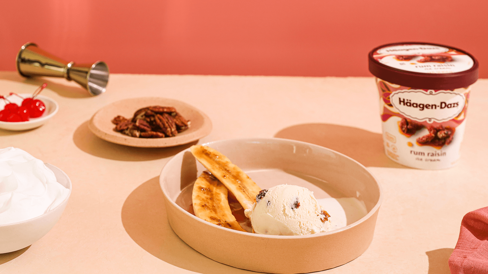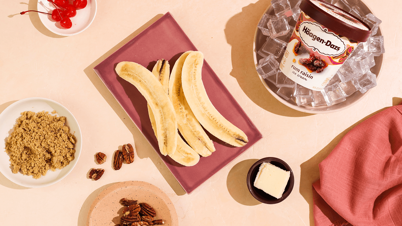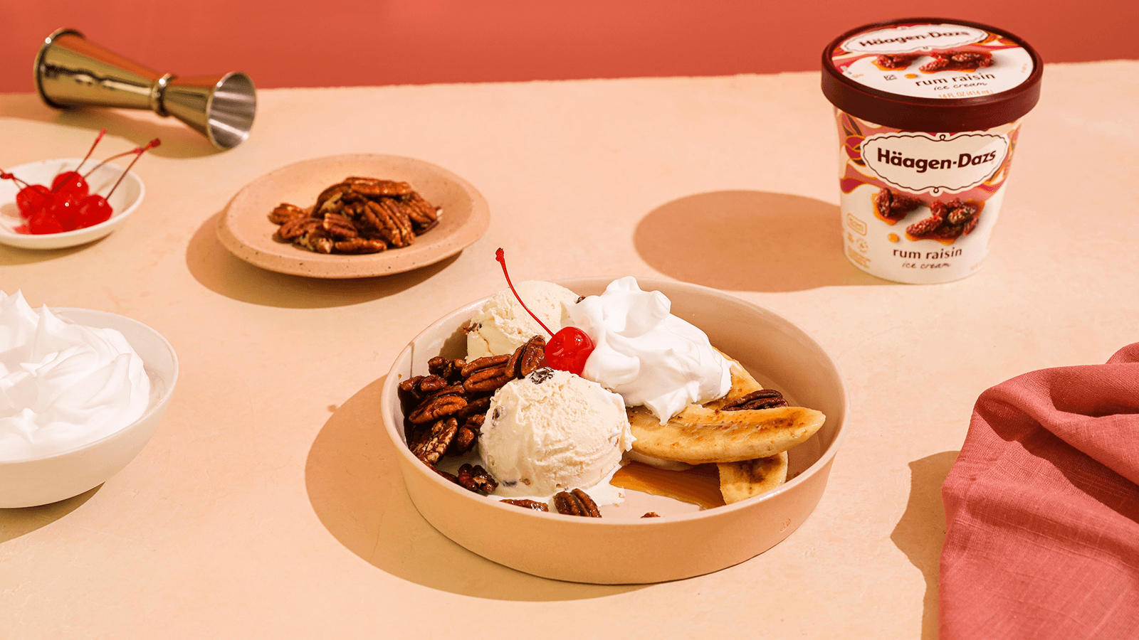 Top bananas with 2 scoops Häagen-Dazs® Rum Raisin Ice Cream. Top ice cream with salted caramel sauce (directions below). Add toasted pecans, sweetened whipped cream, and a maraschino cherry.