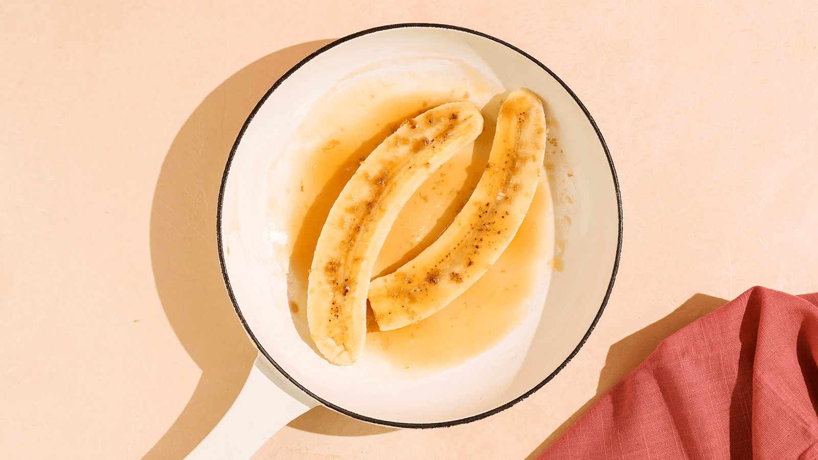 Carefully cut bananas in half lengthwise. Melt butter in medium-sized skillet, add brown sugar, and place banana halves on top, cut side up.