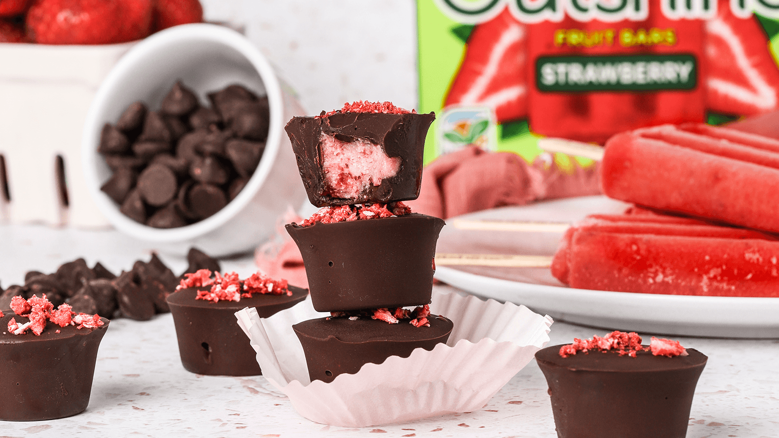 Spoon in 1 tablespoon of chocolate on top of strawberry filling to cover. Garnish with freeze dried strawberries and freeze to set, at least one hour. Enjoy!
