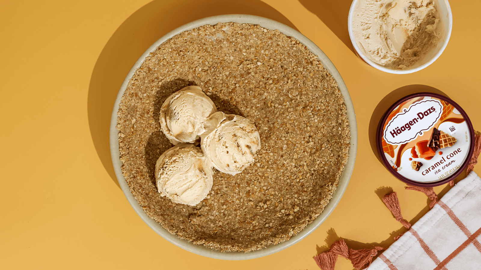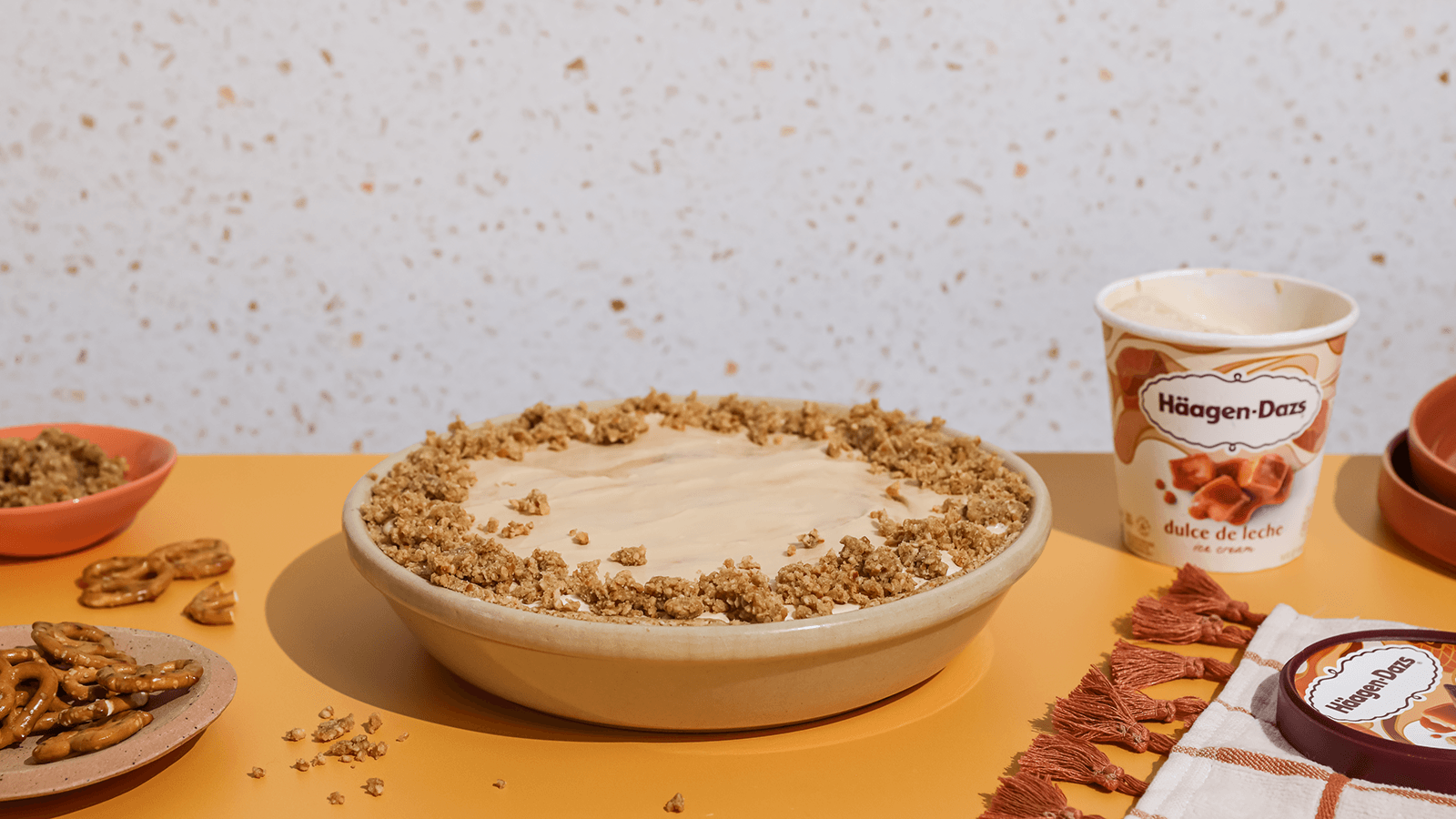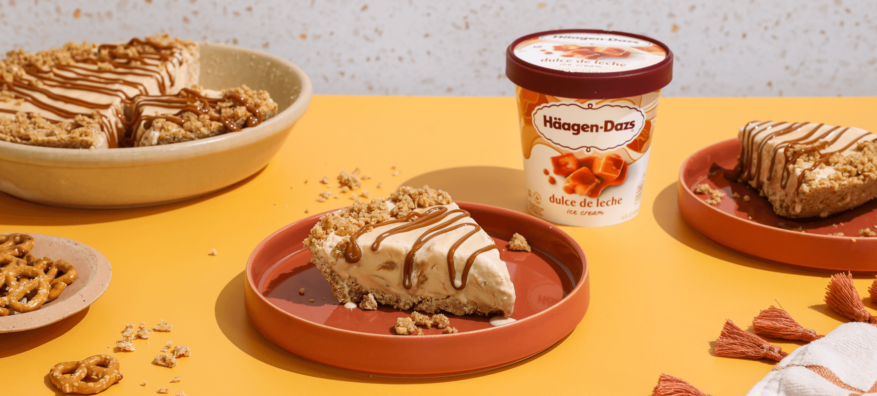 While crust cools, thaw Häagen-Dazs® Dulce de Leche ice cream (10 minutes). When the crust is cool, spread ice cream across the bottom.