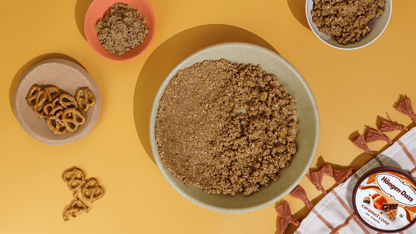 Sprinkle remaining crushed pretzel mixture on the edge of ice cream and transfer to the freezer for 90 minutes to harden.