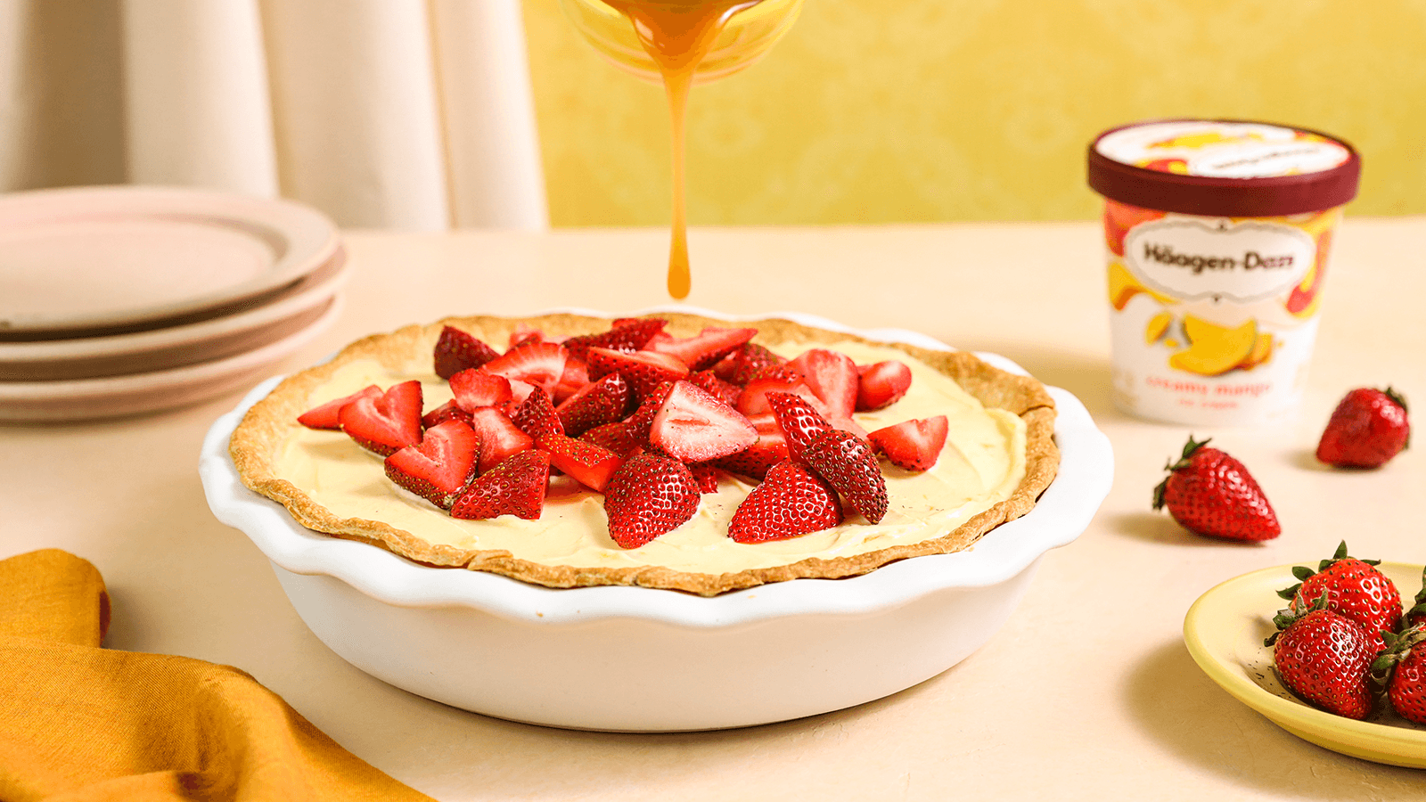 Remove from freezer, place strawberries on top of the ice cream and drizzle caramel (if using) over the pie. Keep in freezer until ready to serve.