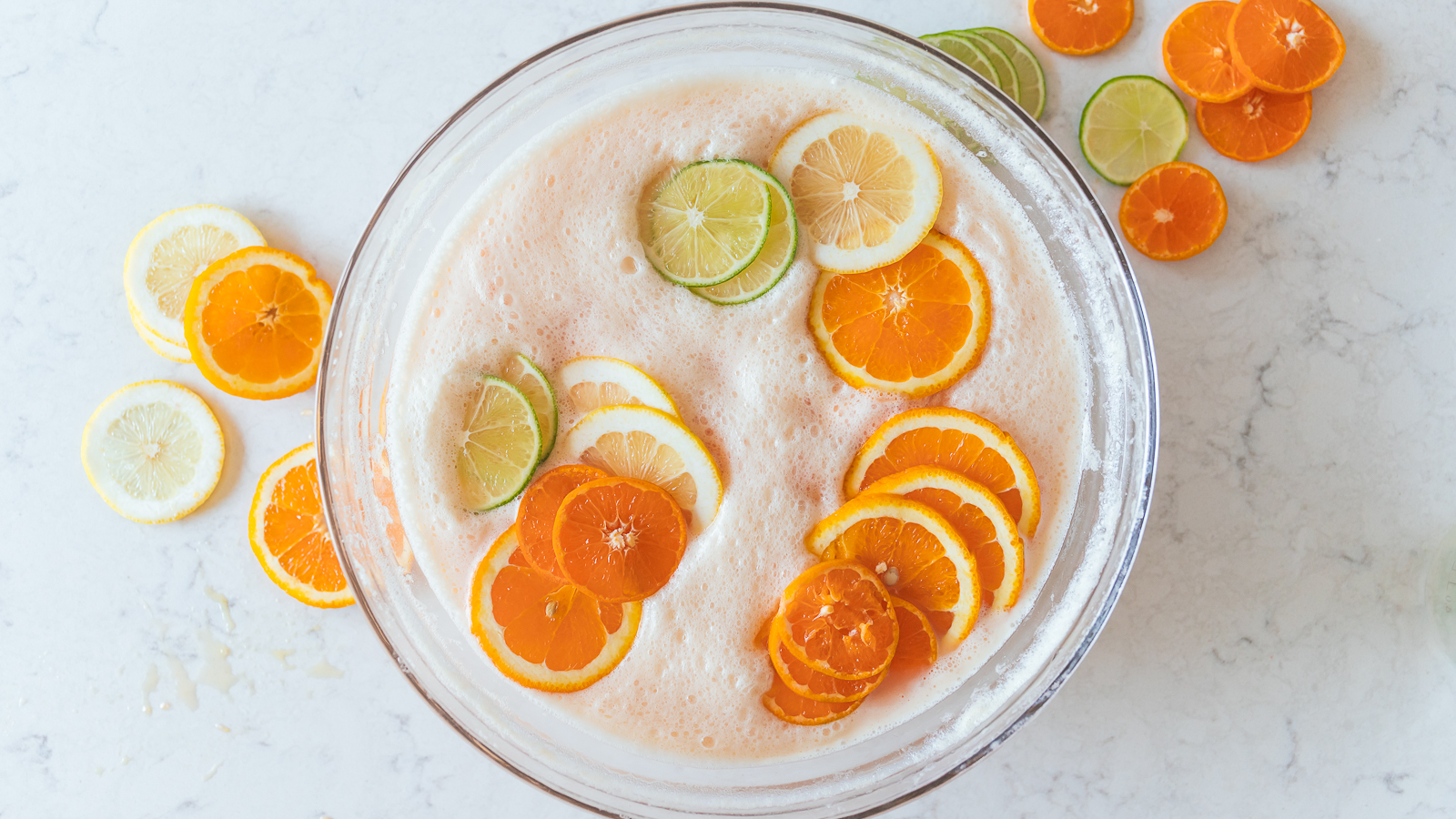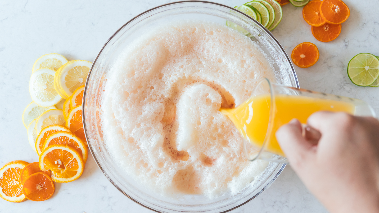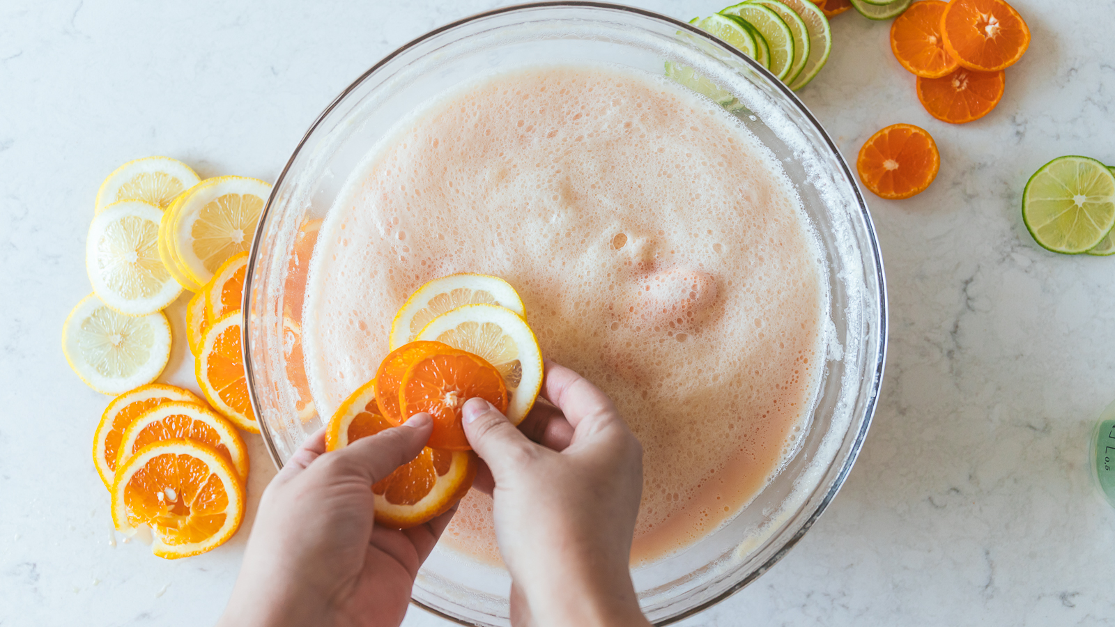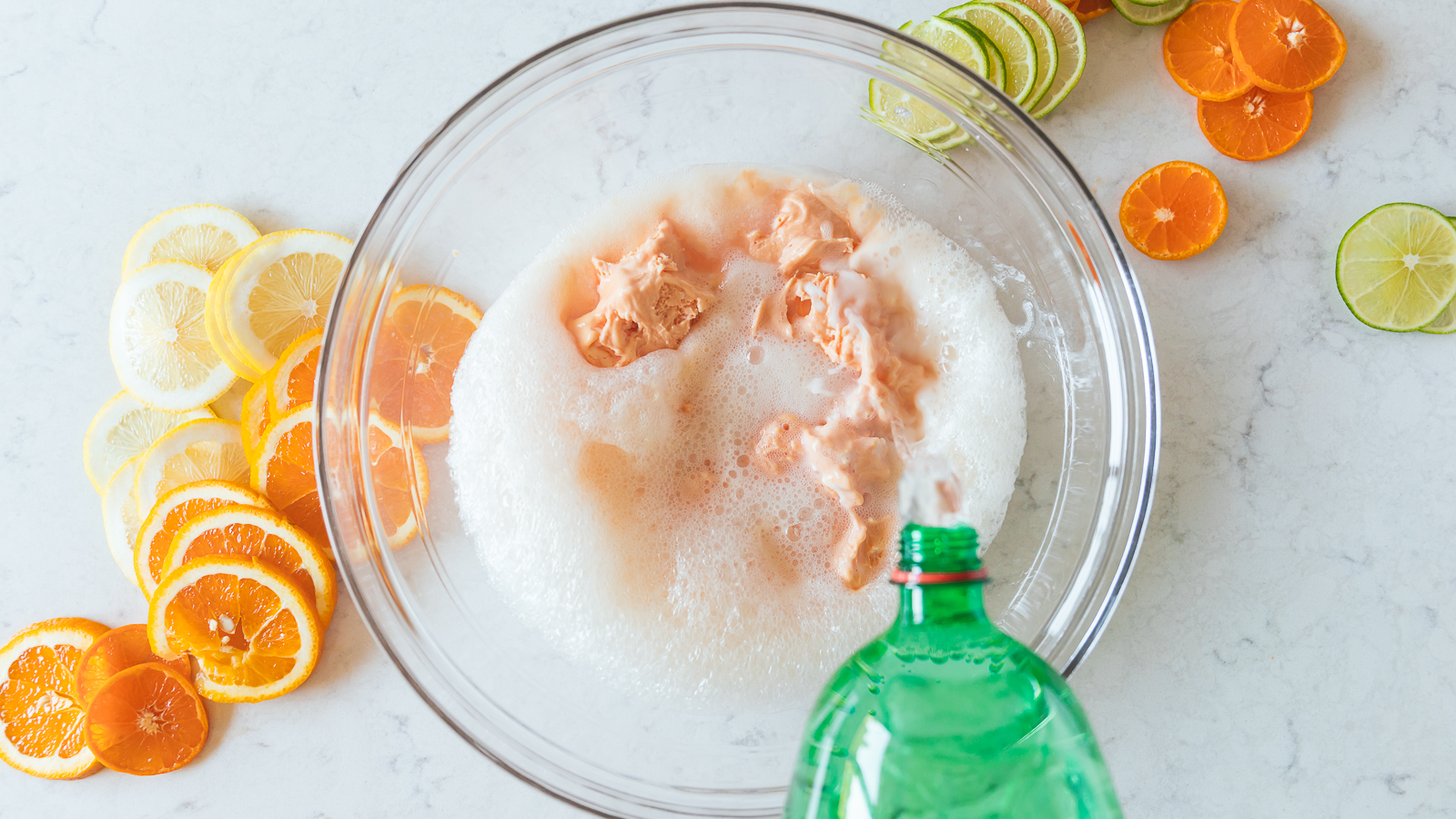 In a large punch bowl, add the tub of sherbet, citrus soda, and orange juice. Mix together.