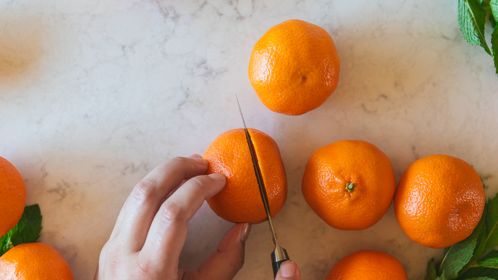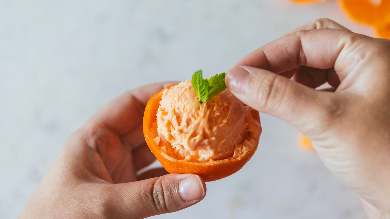 To enjoy now, place the fresh mint on top to look like orange leaves. To enjoy later, place the orange peels back in the freezer, and add the mint when ready to serve.