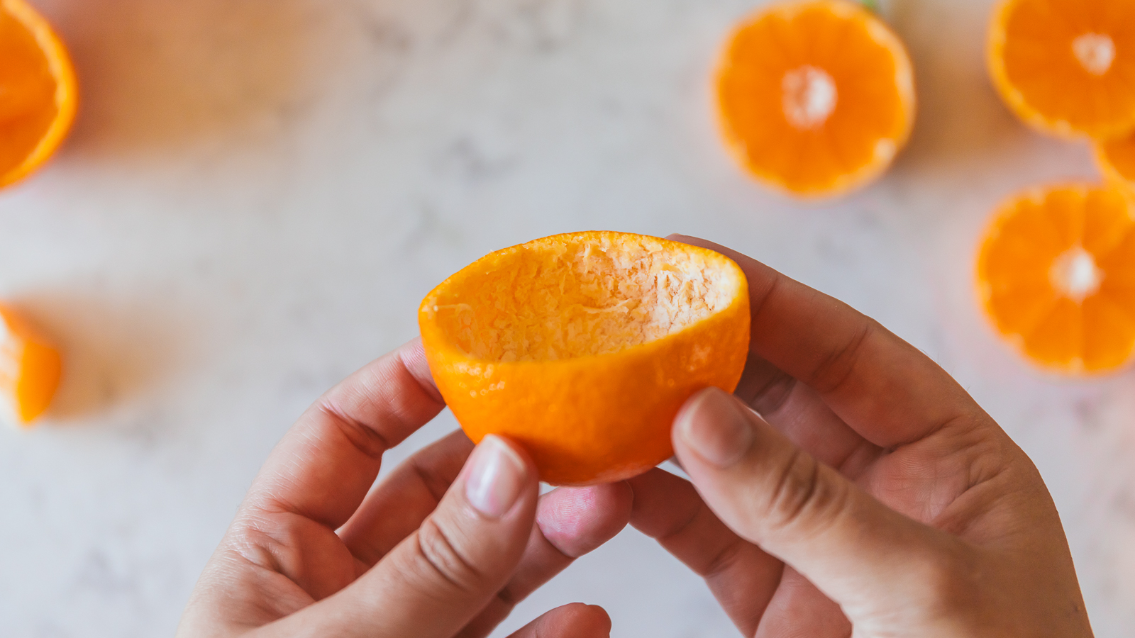 Cut the top 1/4th of the oranges and gently scoop out the orange from the peel.