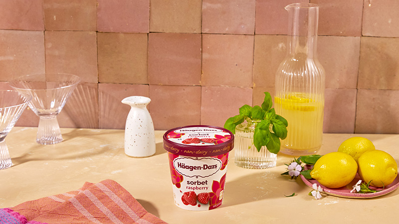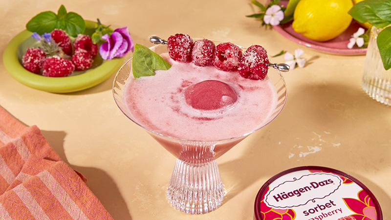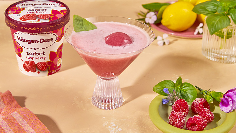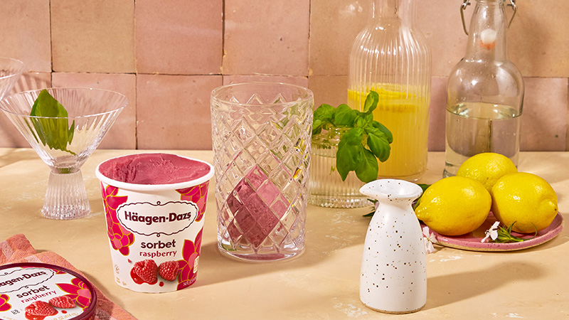 In a shaker, add lemonade, fresh lemon juice, coconut creamer, sparkling water and Haagen Dazs sorbet. Shake