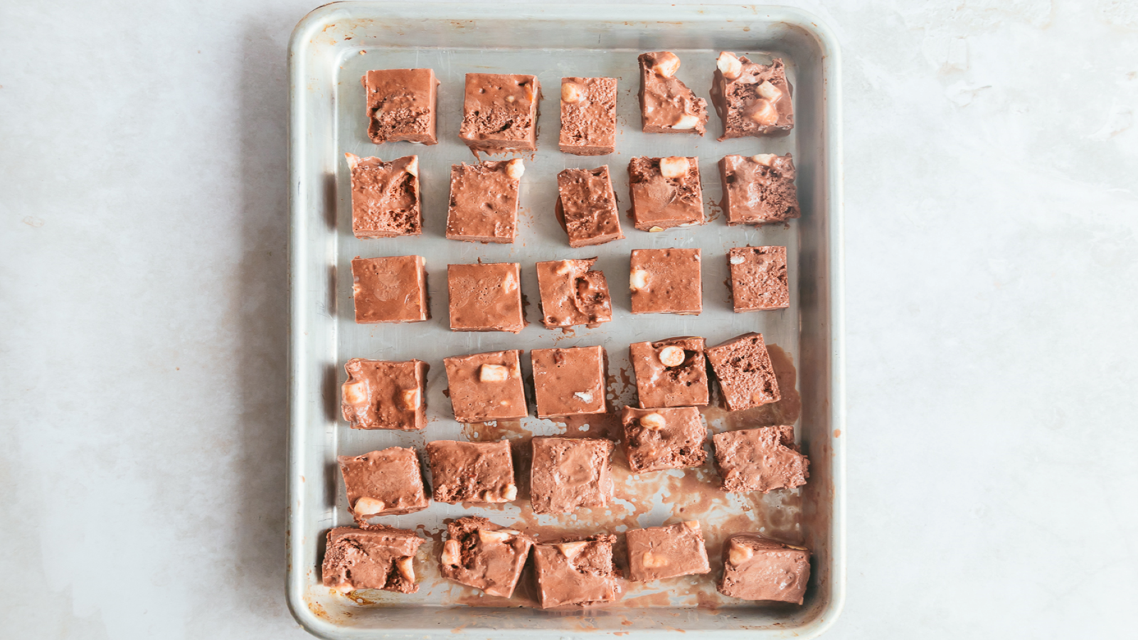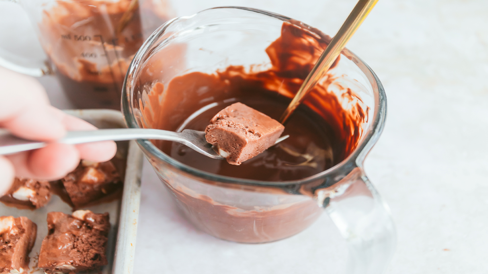 Dip the rocky road squares into the chocolate sauce and place back onto the tray. Work quickly so that the ice cream doesn’t melt.